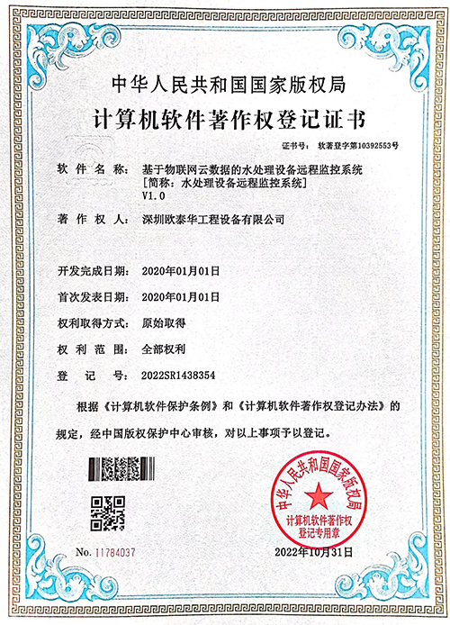 水處理設(shè)備遠(yuǎn)程監(jiān)控系統(tǒng)-軟件著作權(quán)登記證書