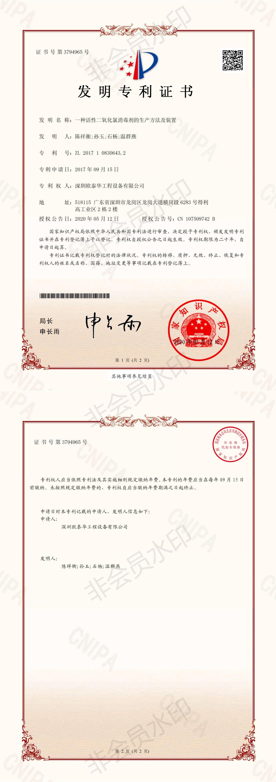 歐泰華一種活性二氧化氯消毒劑生產方法榮獲國家發明專利,該生產方法將高純二氧化氯發生器制備出高濃度活性的二氧化氯消毒溶液,可以直接應用于水消毒處理現場。