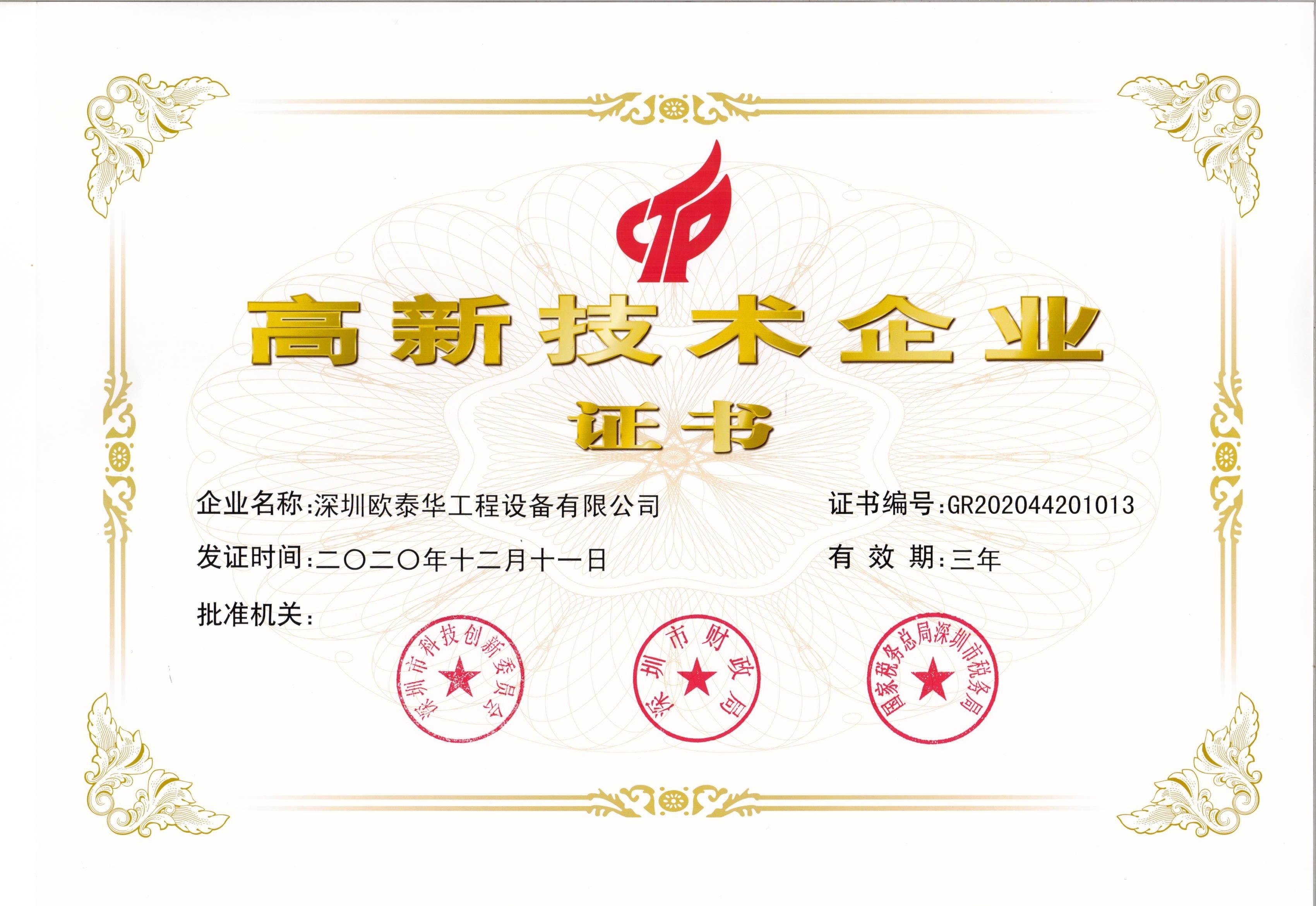 近日,公司收到深圳市科技創(chuàng)新委員會(huì)、深圳市財(cái)政局、深圳市稅務(wù)局聯(lián)合頒發(fā)的《高新技術(shù)企業(yè)證書》。深圳歐泰華工程設(shè)備有限公司憑借不斷增強(qiáng)的自主創(chuàng)新能力、完善的服務(wù)運(yùn)行機(jī)制、穩(wěn)健的成長狀況以及良好的市場發(fā)展前景,已經(jīng)連續(xù)第三次認(rèn)定為“高新技術(shù)企業(yè)”稱號(hào)。