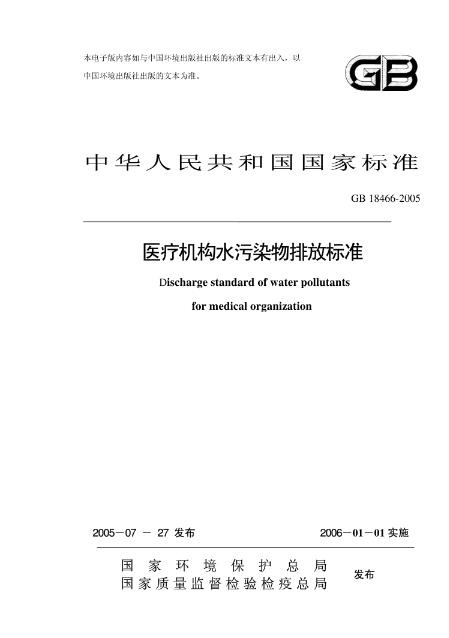 一、國家《醫療機構污水排放標準》GB18466-2005中對醫療機構的污水處理消毒污水排放污泥排放都提出了具體的要求。