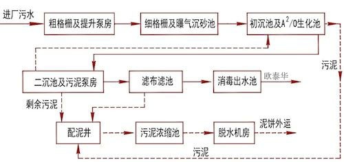 污水廠主要采用“粗格柵及提升泵房+細格柵及曝氣沉砂池+初沉池及多模式A2/O生化池+濾布濾池+消毒池”處理工藝,污泥處理采用“重力濃縮池+離心脫水機”的處理工藝,消毒處理采用二氧化氯消毒工藝,設計出水執(zhí)行 GB18918-2002 一級 A 標準。