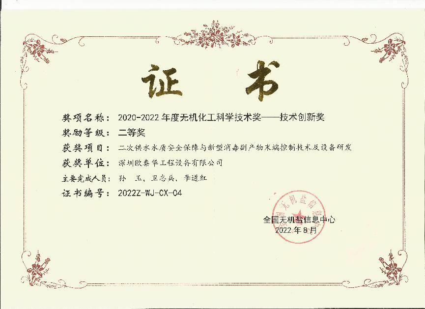 深圳歐泰華工程設(shè)備有限公司的《二次供水水質(zhì)安全保障與新型消毒副產(chǎn)物末端控制技術(shù)及設(shè)備研發(fā)》項目,榮獲2020-2022年度無機(jī)化工技術(shù)創(chuàng)新獎。