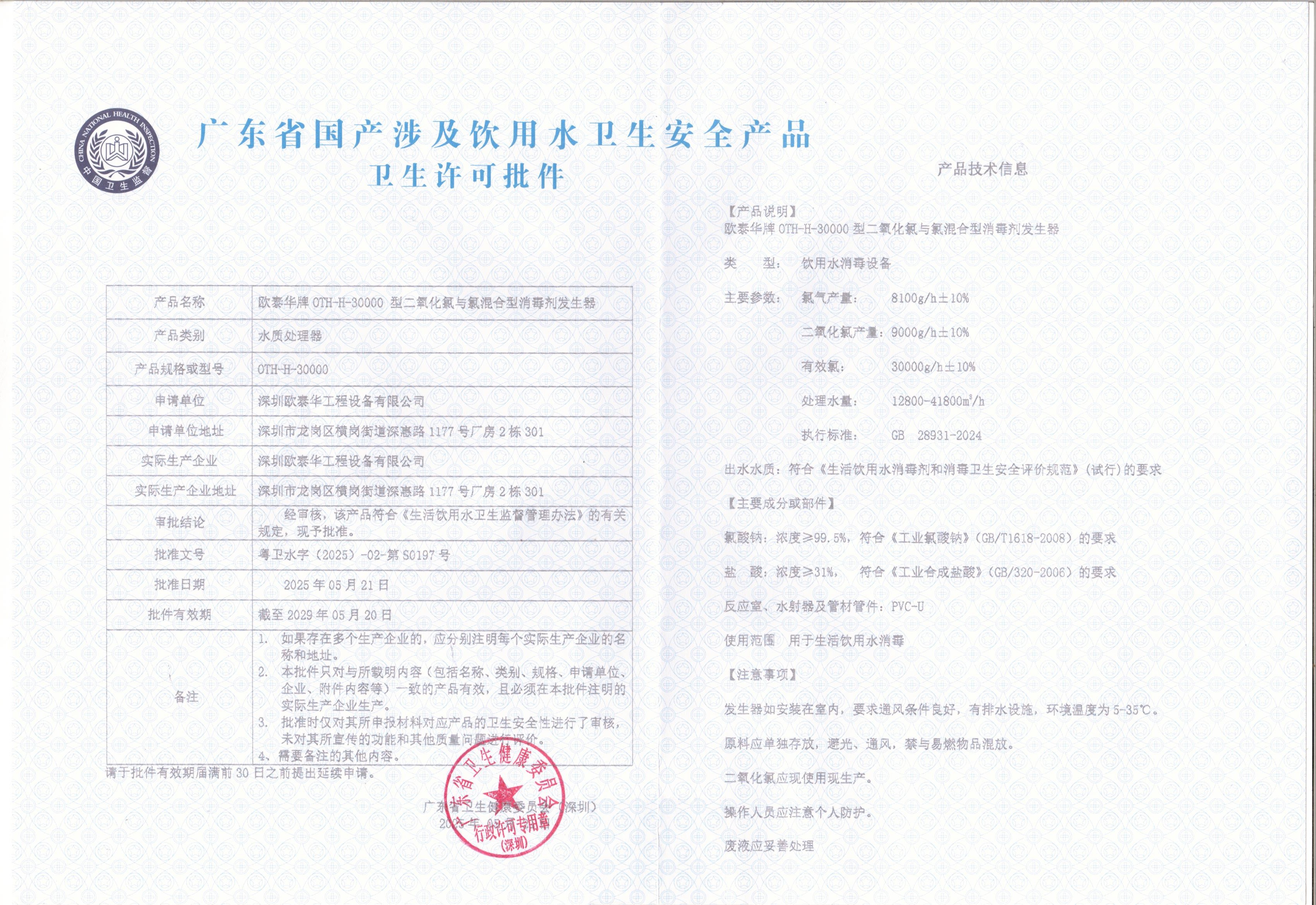 深圳歐泰華的核心產品——二氧化氯與氯混合消毒劑發(fā)生器,近期順利完成涉水衛(wèi)生許可批件更新,實力再獲官方蓋章!